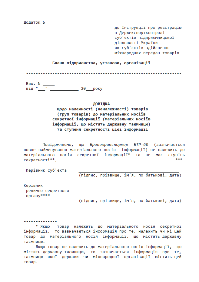 • довідку (за формою, яка визначена у Додатку 5 до зазначеної вище Інструкції) щодо належності (неналежності) товарів (груп товарів), які надано для попередньої експертизи, до матеріальних носіїв секретної інформації (матеріальних носіїв інформації, що містять державну таємницю) та ступеня секретності цієї інформації (ступеня секретності таких товарів), що засвідчується підписами керівника суб'єкта або уповноваженою на те особою і керівника його режимно-секретного органу (за наявності такого органу на підприємстві);