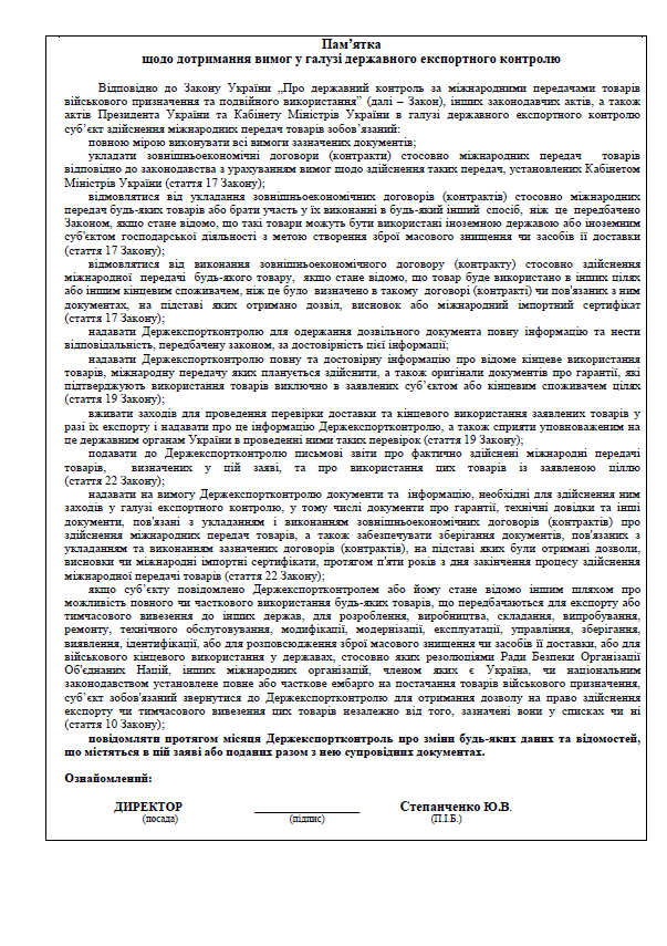 Зразок оформлення Пам'ятки щодо дотримання вимог у галузі державного експортного контролю