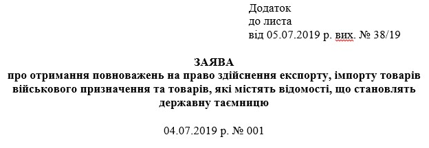 Форма заяви про отримання повноважень на право здійснення експорту, імпорту товарів військового призначення та товарів, які містять відомості, що становлять державну таємницю (далі – заява), наведена у додатку до Інструкції щодо заповнення заяви про отримання повноважень на право здійснення експорту, імпорту товарів військового призначення та товарів, які містять відомості, що становлять державну таємницю, затвердженої наказом Міністерства економічного розвитку і торгівлі України від 23.01.2019 № 68, зареєстрованим у Міністерстві юстиції України 20.02.2019 за № 174/33145, який набрав чинності 15.03.2019 (офіційно опублікований в Офіційному віснику України від 15.03.2019 № 21).