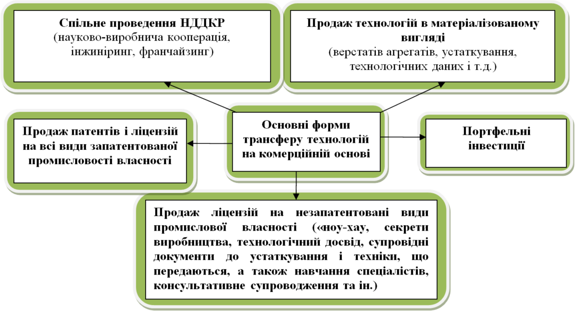 Нагадаємо, що поняття «трансфер технологій» містить декілька підходів до його визначення. Так, згідно з офіційними рекомендаціями Організації з економічного співробітництва та розвитку (OECD) «Стандартна практика, що пропонується для обстежень досліджень та експериментальних розробок» , трансфер технологій – це передача науково-технічних знань і досвіду для надання науково-технічних послуг, застосування технологічних процесів, випуск продукції.