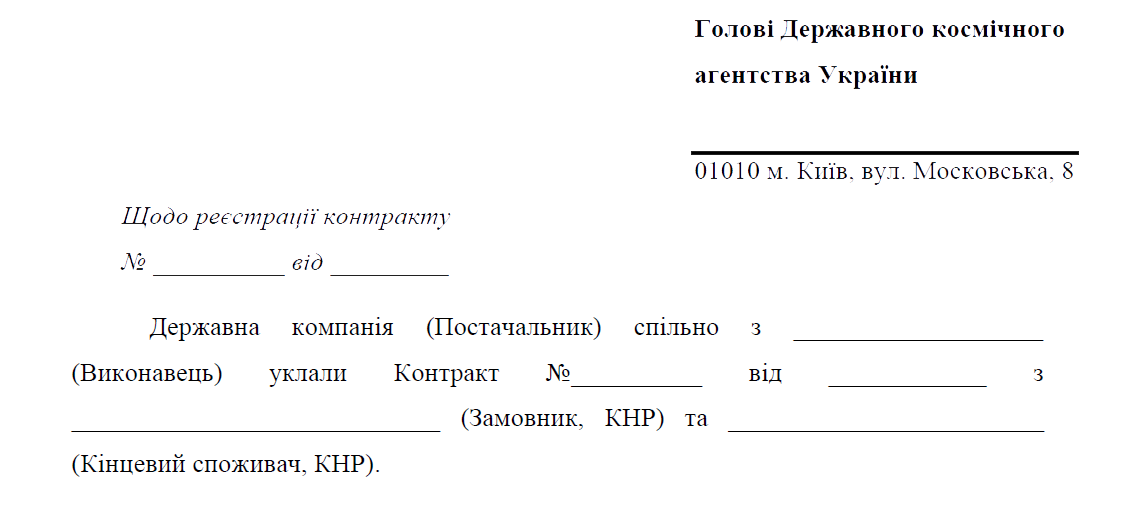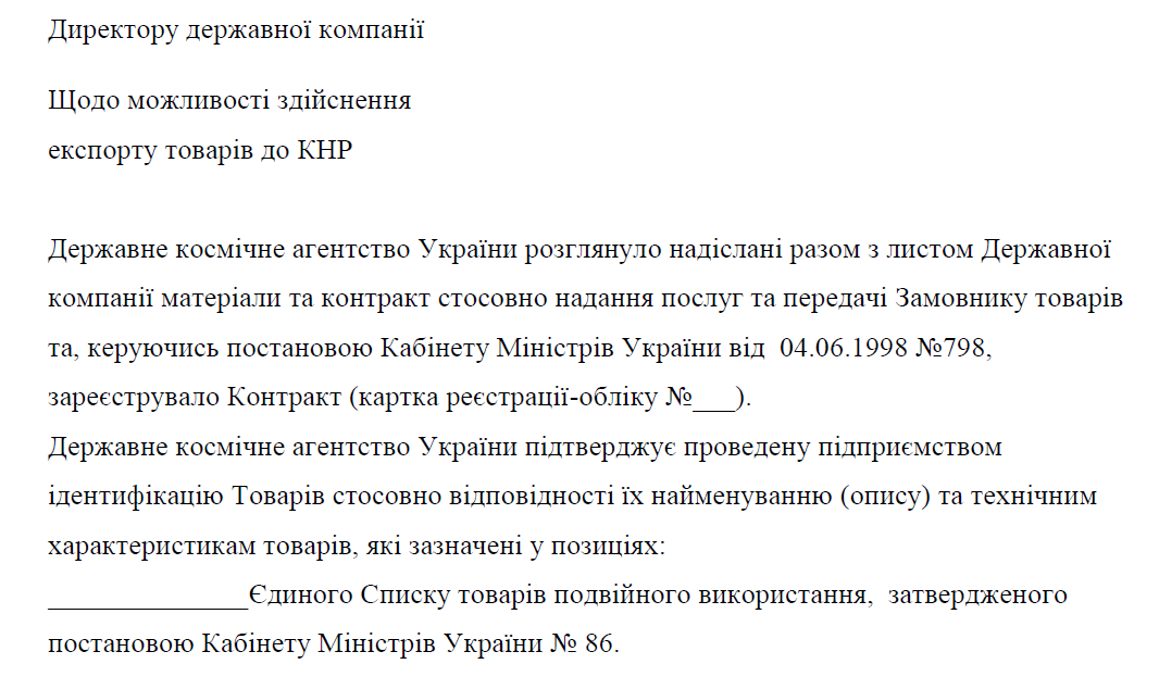 Зважаючи на те, що товари, експорт яких планувалося здійснити, пов’язані з космічною галуззю, їх попередня ідентифікація та реєстрація зовнішньоекономічного контракту повинна проводитись із залученням Національного космічного агентства України. Нижче наводяться зразки типового листування з НКАУ та форми необхідних документів